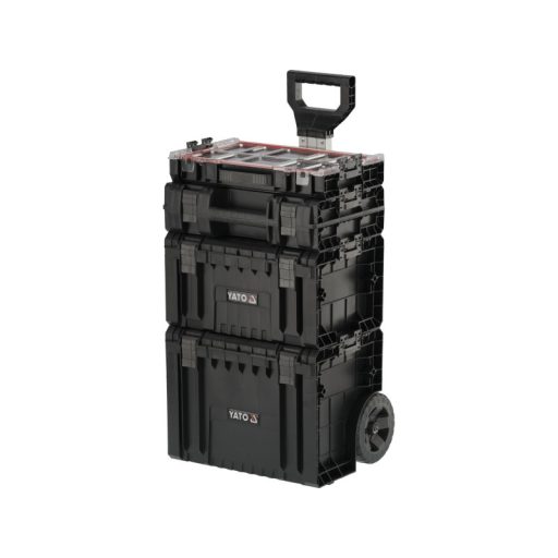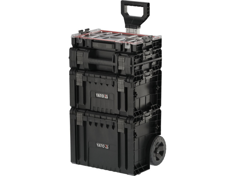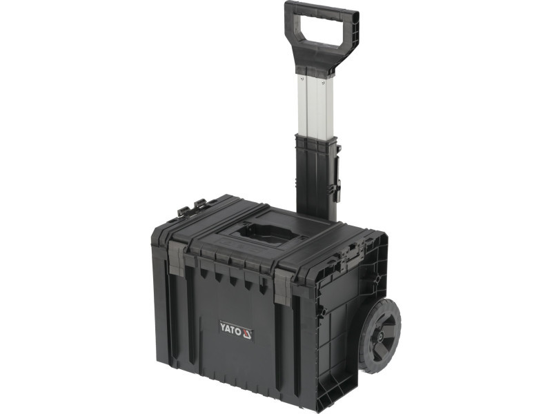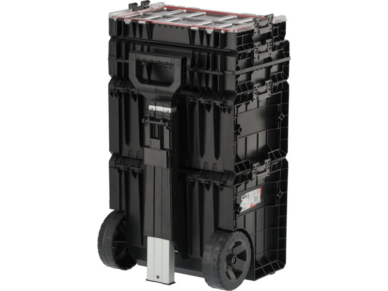Az egész egy 4 részből álló, teleszkópos fogantyúval ellátott, kerekeken gördülő mobil készlet, fémtengelyre szerelt nagyméretű gumibevonatú kerekekkel. Ezenkívül az erős poliamidból készült erős rögzítőelemek és oldalsó csatlakozók is gondoskodnak a szállított szerszámok biztonságáról. A fedelekbe szerelt rugalmas tömítések fröccsenésbiztos lezárást biztosítanak, ami megvédi a tartalmat a fröccsenéstől és a portól.