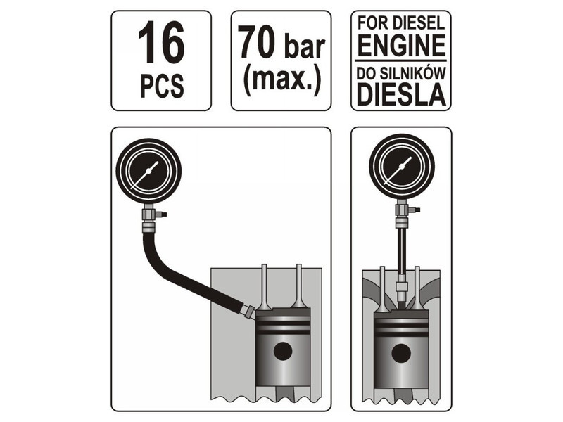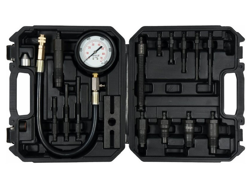Az autóipari szervizekben professzionális használatra tervezett mérőműszer. A VW, Audi, Seat, Skoda, Fiat, Alfa Romeo, Lancia, Peugeot, Ford, Opel, Toyota, Mercedes, Rover kompressziós gyújtású motorok diagnosztikájához. C45-ös acélból készült, a megfelelő szerszám élettartam biztosítása érdekében felületi oxidációval. - Izzítógyertya adapter 91 mm, M10 x 1 - Izzítógyertya adapter 119 mm, M10 x 1 - Izzítógyertya adapter 135 mm, M10 x 1,25 - Izzítógyertya adapter 118 mm, M22 x 1,5 - Izzítógyertya adapter 113 mm, M10 x 1 - Izzítógyertya adapter 102 mm, M10 x 1 - Izzítógyertya adapter 83 mm, M10 x 1 - Izzítógyertya adapter 64 mm, M10 x 1,25 - izzítógyertya adapter 47 mm, M12 x 1,25 - injektor adapter 88 mm, M24 x 1,5 - injektor adapter 73 mm, M22 x 1,5 - injektor adapter 63 mm, M24 x 2 - injektor adapter 75 mm, M20 x1,5 - univerzális adapter 160 mm - H-szerelvény - nyomásmérő 500 mm - kioldószelep - használati utasítás - hordtáska