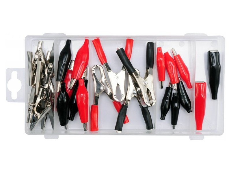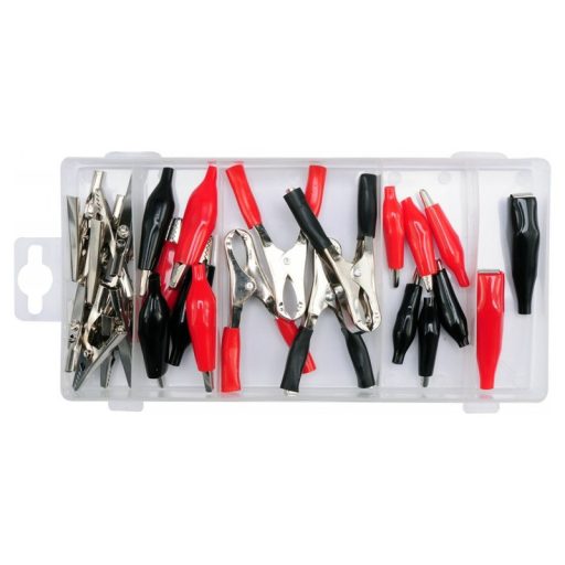 Elektromos krokodil készlet. A csomag tartalma 28 darab különböző méretű, szigetelt és szigeteletlen krokodilcsipesz. Az egész készlet egy praktikus szortírozó dobozban van elhelyezve.