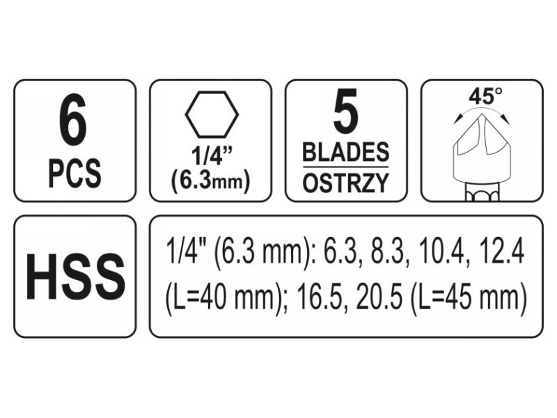 | Alkalmazás | lyukak éleinek letörése fémben, fában, laminált táblákban stb., M5, M6, M8, M10 csavarokhoz, PH2, PH3, PZ2, PZ3 fejű csavarokhoz |