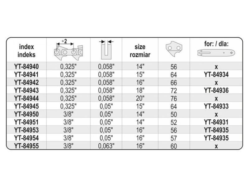 Benzines és elektromos láncfűrészekhez készült - különösen ajánlott az YT-84900 láncfűrészhez. Tiszta és közepesen szennyezett fa vágásához ajánlott mind háztartási, mind professzionális használatra. A YATO YT-84940 lánc láncfűrészekhez használható: - Alpina: A40, A40E, P400, P450, P460, P500, P510, P522, PRO540, PRO600, PROF-41, PROF-45 Dolmar: 109, 110, 111, 112, 113, 114, 115i, 116, ES1800, PS460, PS4600, PS4605, PS500, PS5000, PS510, PS5100S, PS540 - Echo: Homelite: 250, 252, 290, 290C, 300, 340, 340C, 3850B, 3850C, 415B, 444, 4550B, HCS404040, HCS4045, HCS4446CA - Husqvarna: 133, 136, 137, 140, 141, 142, 154, 234, 235, 238, 240, 240e, 242, 242XP, 246, 254, 254XP, 257, 261, 262, 338XPT, 339XP, 340, 345, 346, 346XP, 350, 351, 353, 357, 357XP, 359, 36, 365, 40, 41, 42, 435, 435E, 44, 440E, 444, 445, 445E, 45, 450E, 455 RANCHER, 455E ANCHER, 460, 460 RANCHER, 50, 51, 55, - Jonsered: 2012, 2014, 2015, 2016, 2036, 2040, 2041, 2045, 2050, 2051, 2054, 2055, 2063, 2141, 2145, 2147, 2149, 2150, 2152, 2153, 2155, 2156, 2159, 2163, 370, 380, 410, 420, 425, 435, 45, 450, 451, 451EVS, 452, 455, 490, 49SP, 50, 51, 510, 52, 520, 521, 525, 535, 590, CS2149W, CS2152W, - Makita: 45, DCS430, DCS43001, DCS4300I, DCS431, DCS460, DCS4600S, DCS4630, DCS500, DCS5000, DCS5030, DCS520, DCS5200I - NAC: NO-CS38, SPS01-45, SPS01-52, SPS02-45, YD 40/45, YD40, YD52 - Oleo-Mac: E300F, GS350, GS370, GS410CX - Partner: 850, 938, 940, 941, 942, 945, 946, 47, 950, 950 Super, 950A, 951, 952, 956, 962, E300F, GS350, GS370, GS410CX: P500, P5000, P5500 - Stihl: 1200EL, 1400EL, 1450EL, 1500EL, 1650, 1650EL, 365, 400, 405, 410, 450, 460, 465, 470, 495, 500, 510, 540, 545, P500, P5000, P5500: 024, 026, 028, 029, 030, 031, 032, 034, 036, 039, MS200, MS240, MS260, MS270, MS280, MS290, MS360, MS361, MS36E, MS390