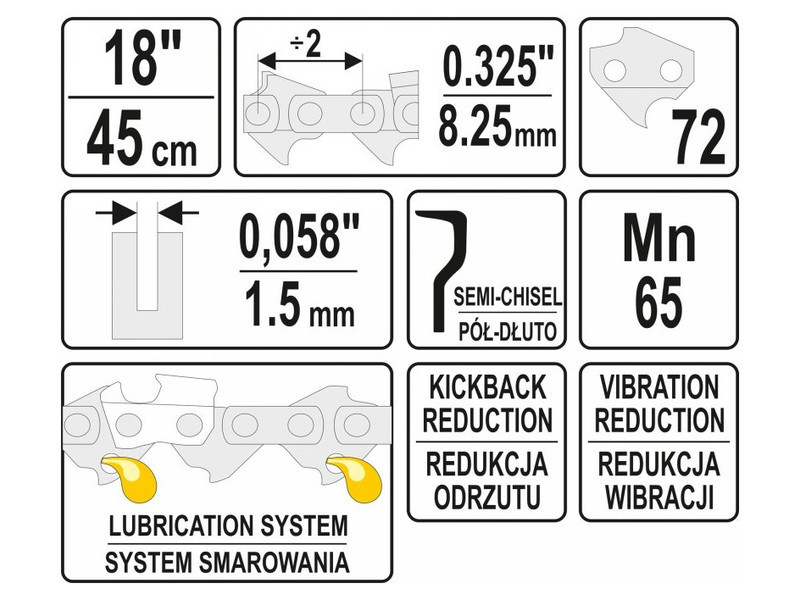 Hossza 18", 72 láncszem, osztás 0,325", szélesség 0,058" (1,5 mm).