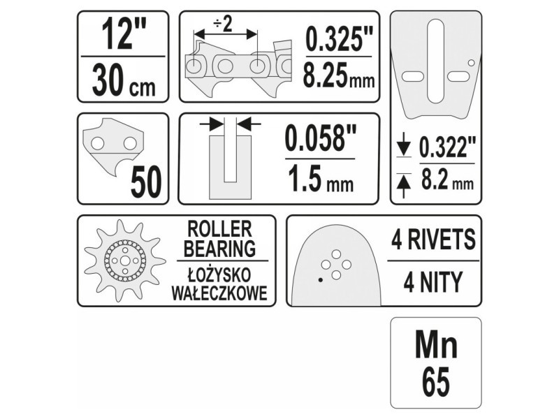 Hossza 12", 50 láncszem, osztás 0,325", szélesség 0,058" (1,5 mm).