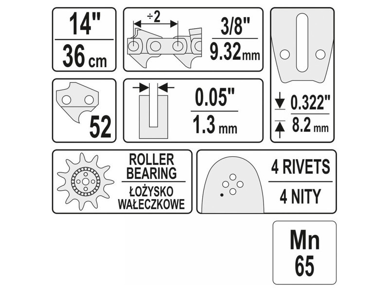 Láncvezető láncfűrészekhez. Mn65 mangánacélból készül, amely jelentősen növeli a rúd kopás- és túlmelegedéssel szembeni ellenállását, így meghosszabbítja élettartamát.