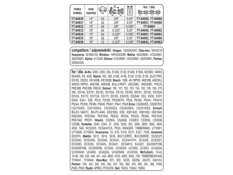 A YATO vezetőrudakat otthoni és professzionális használatra tervezték, és a ház körüli, kerti munkákhoz ajánlják. Alkalmasak fakivágási munkákhoz is. A vezetőrudakat a YATO YT-84951 vagy YT-84960 láncokkal javasolt használni. Más gyártók láncaival is használhatóak.