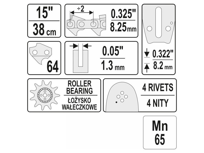 Láncvezető láncfűrészekhez. Mn65 mangánacélból készül, ami jelentősen növeli a rúd kopás- és túlmelegedéssel szembeni ellenállását, meghosszabbítva ezzel az élettartamát.