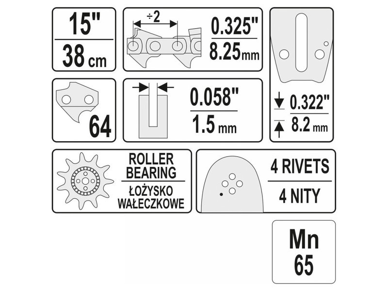 Láncvezető láncfűrészekhez. Mn65 mangánacélból készül, ami jelentősen növeli a rúd kopás- és túlmelegedési ellenállását, meghosszabbítva ezzel az élettartamát.