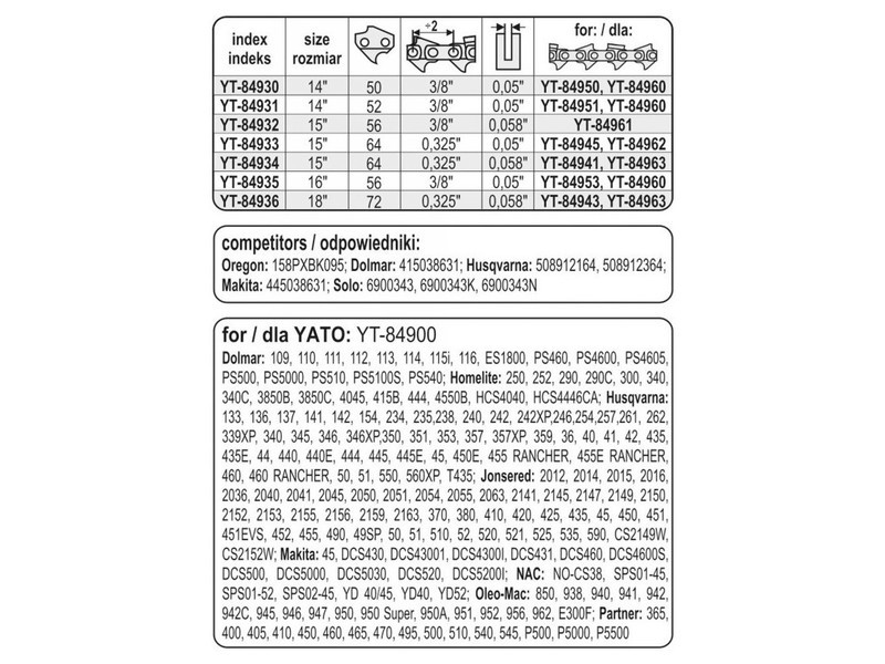 A YATO YT-84934 vezetőrudat többek között a YATO YT-84900 láncfűrészhez tervezték. A vezetőrudakat a YATO YT-84941 vagy YT-84963 láncokkal javasolt használni. Más gyártók láncaihoz is használhatóak.