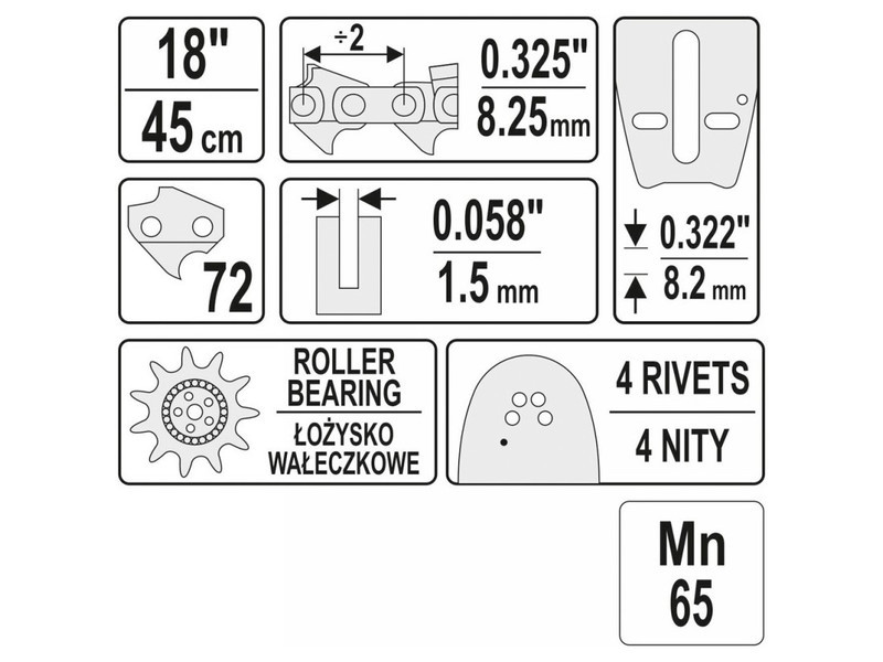 Láncvezető láncfűrészekhez. Mn65 mangánacélból készül, ami jelentősen növeli a rúd kopás- és túlmelegedési ellenállását, meghosszabbítva ezzel az élettartamát.