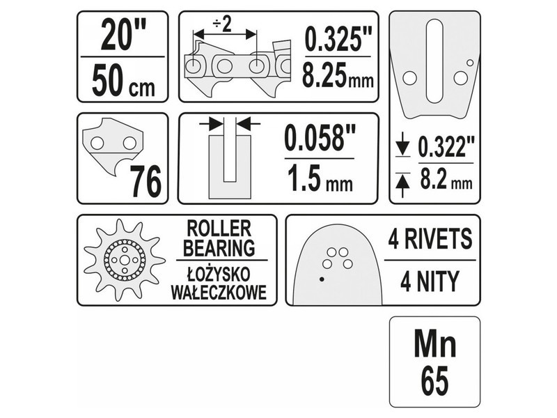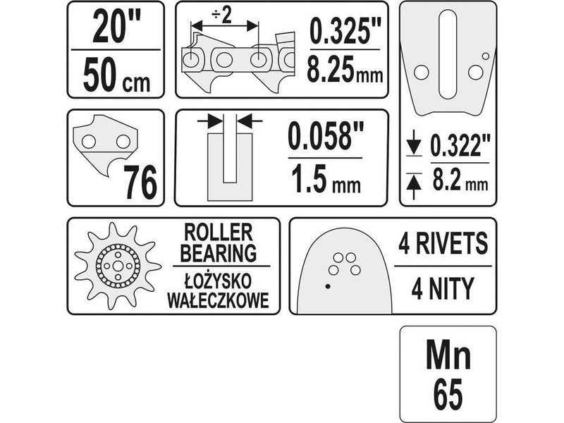 Hossza 20", 76 láncszem, osztás 0,325", szélesség 0,058" (1,5 mm).