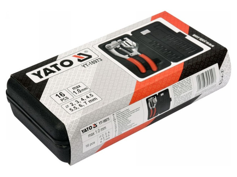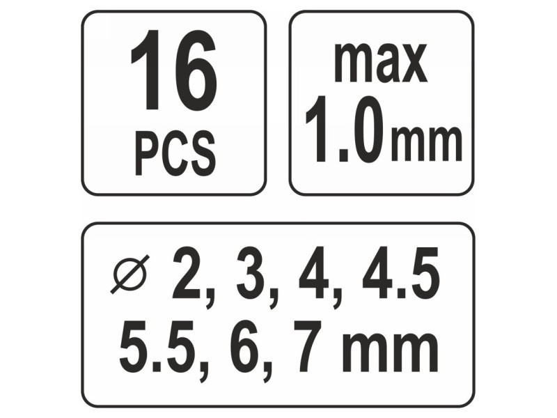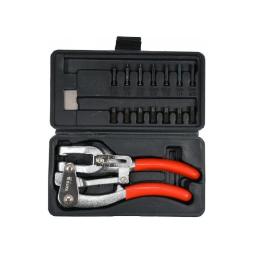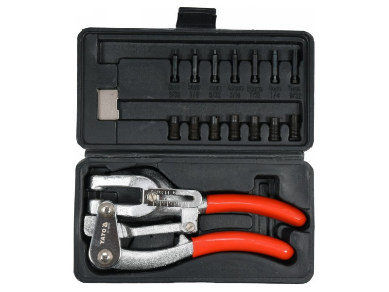 A készlet cserélhető, edzett átmérőjű szerszámokat és lyukasztókat tartalmaz : 2, 3, 4, 4,5, 5,5, 6, 7 mm-es lyukasztókkal. Állítható lyukasztási távolság az anyag szélétől 6,35 és 38 mm között.
