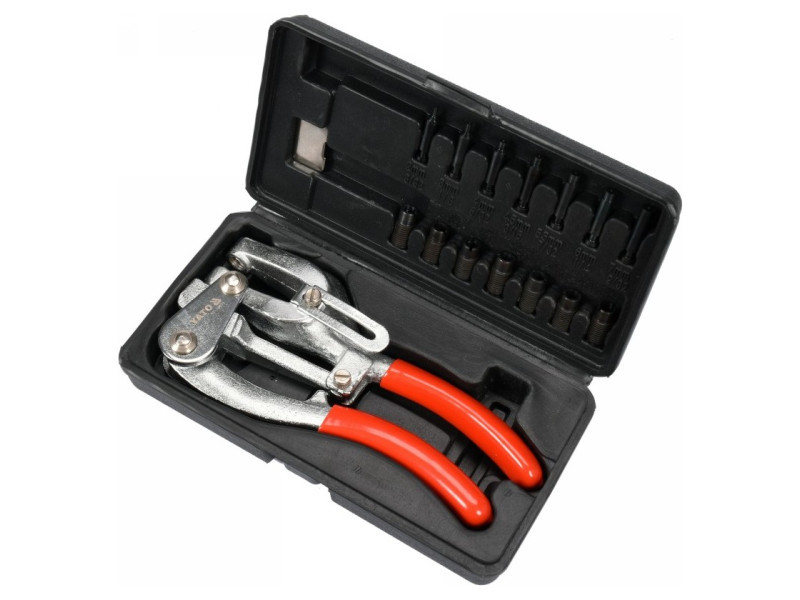 Kovácsolt fogó 14 szerszámból és lyukasztóból álló készlettel lyukak készítéséhez puha fémlemezeken 1 mm vastagságig, valamint karton, műanyag és egyéb anyagok perforálásához.