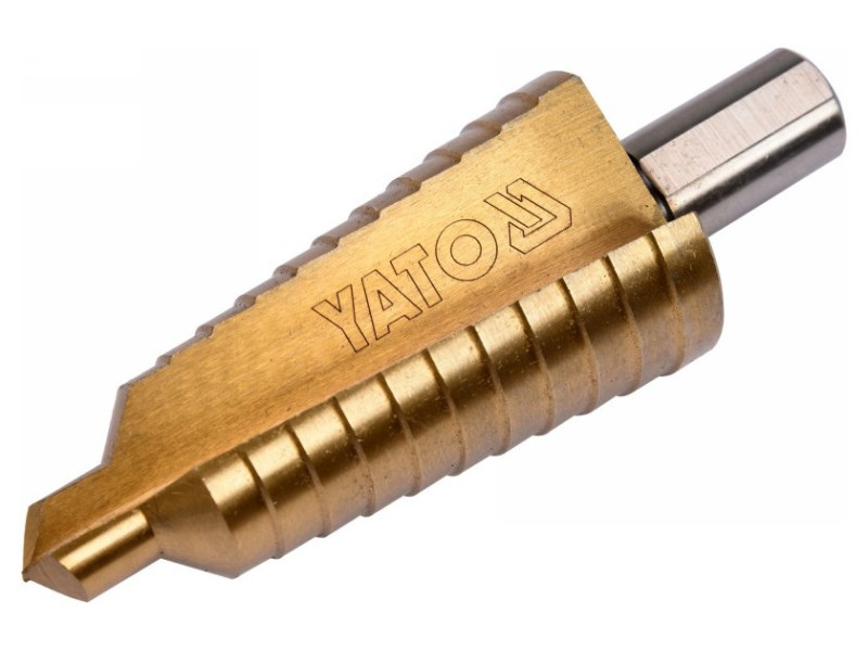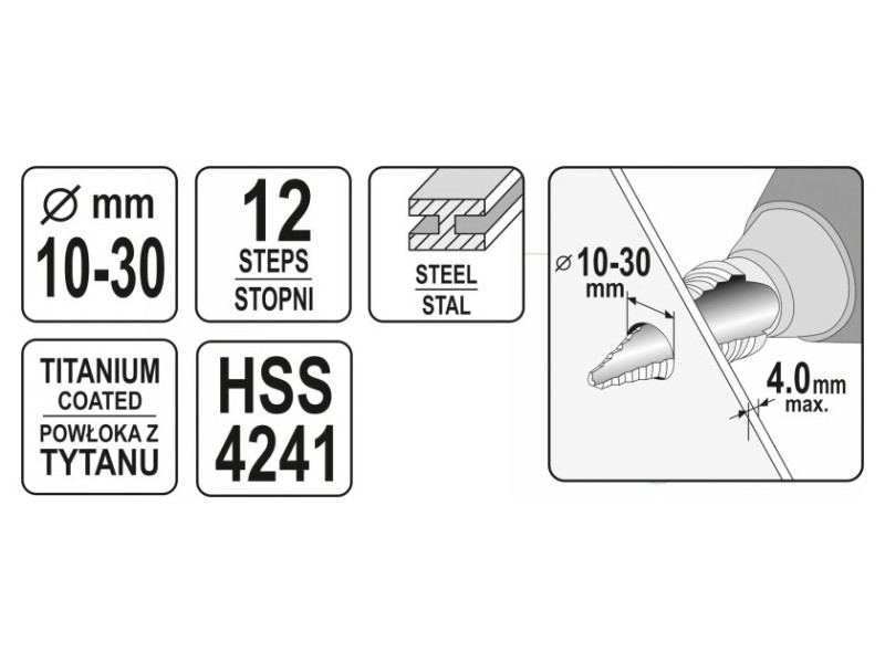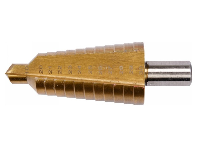 Lépcsős fúrófej, amely kiváló minőségű rozsdamentes, szerkezeti és hidegen hengerelt acél, színesfémek, acéllemezek, műanyagok fúrására szolgál.