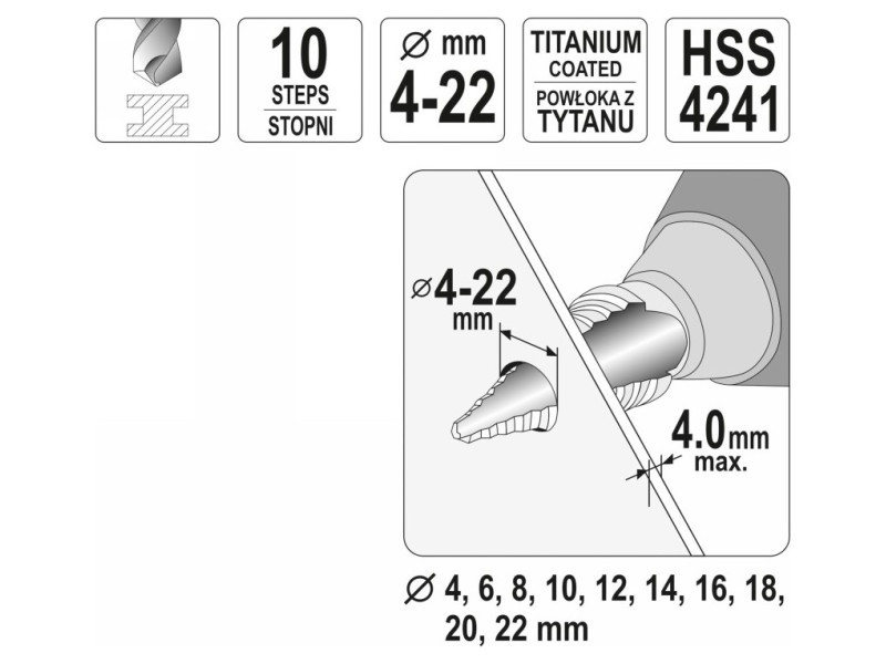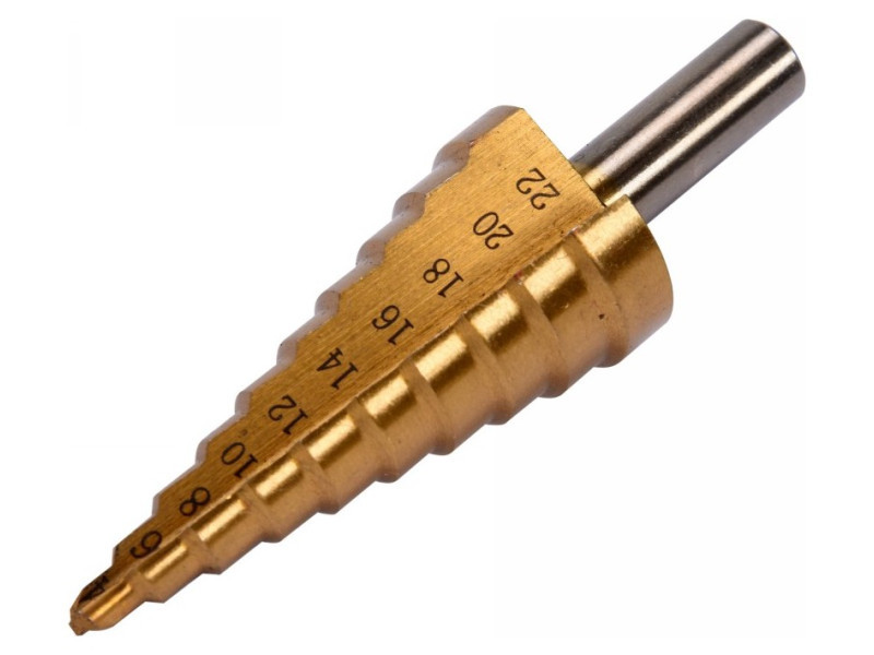 4 - 22 mm-es lépcsős fúrószár HSS 4241-ből, titán-nitrid bevonattal.