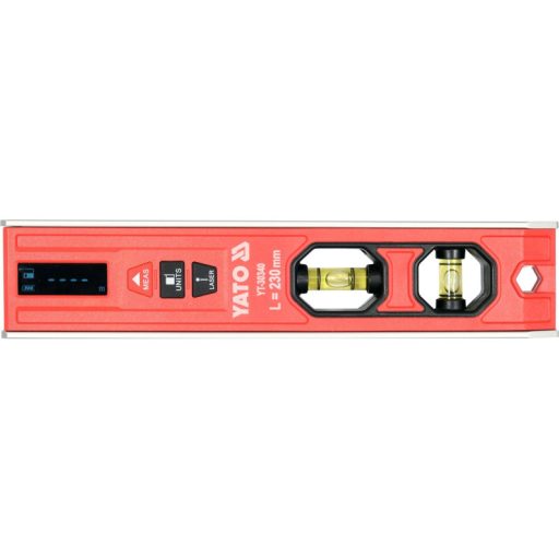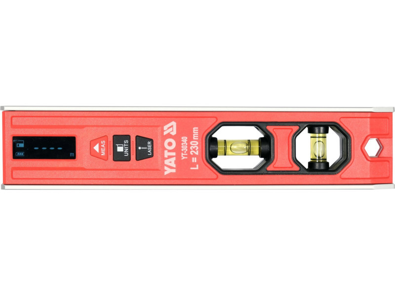 Elektronikus 230 mm-es torpedószint lézerrel távolságméréshez és vízszintes vagy függőleges vonal meghatározásához. A távolságmérő álló vagy dinamikus üzemmódban (a távolság mérés közbeni változtatása) működtethető. A mérés az elülső vagy a hátsó élről lehetséges. Az eredmények az LCD-képernyőn jelennek meg. A ház felső felületébe hornyot (prizma) vágtak. A vízmérték két üveglégcsővel rendelkezik, amelyek egymástól függetlenül megvilágíthatók. 3 erős mágnes van a talpba szerelve. A test alumínium szelvényből, a ház ABS-ből készült.