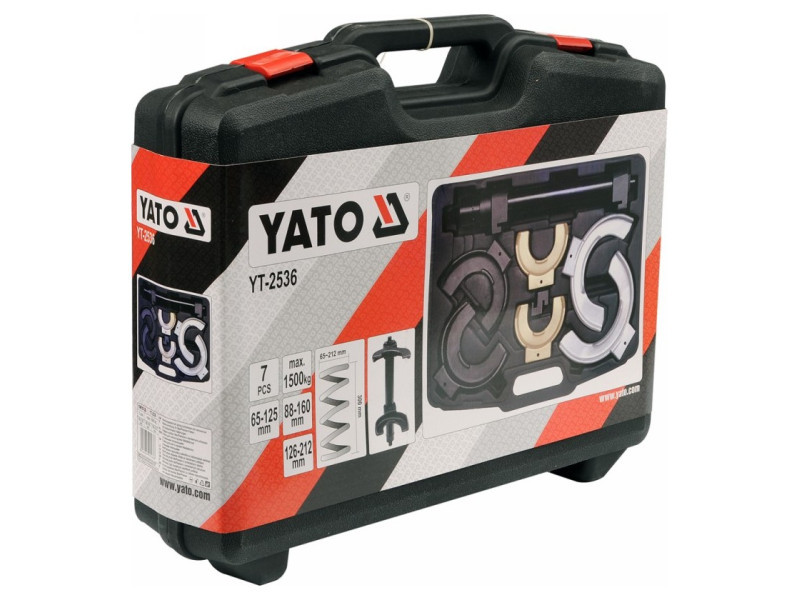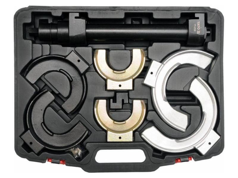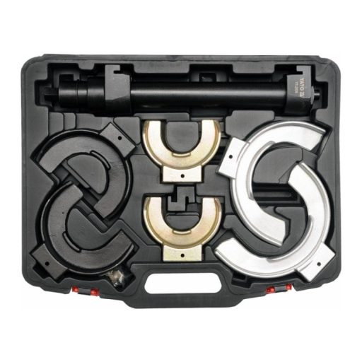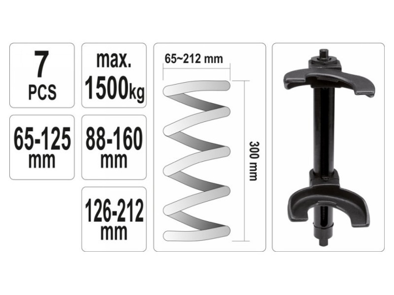 Professzionális McPherson rugóhúzó cserélhető fogantyúkkal. Hétrészes készlet. A készletet McPherson típusú felfüggesztések lengéscsillapítóinak cseréjéhez tervezték. A lehúzó cserélhető fogantyúkkal rendelkezik, így 65 mm és 212 mm átmérőjű rugók kezelése lehetséges. Anyaga: CrMo SCM415 ötvözött acél, foszfátozott felület. Egy oszlopos lehúzó 45 mm csőátmérővel. Hajtás: 21 mm-es csavar finom trapézmenettel. Három ponton állítható fogantyúk a rugó görbületéhez igazítva. A tartományban állítható: 65 mm - 125 mm, 88 mm - 160 mm, 126 mm - 212 mm.Teljes hossz 400 mm (rugó magassága 300 mm).Maximális húzóerő: 1500 kg.