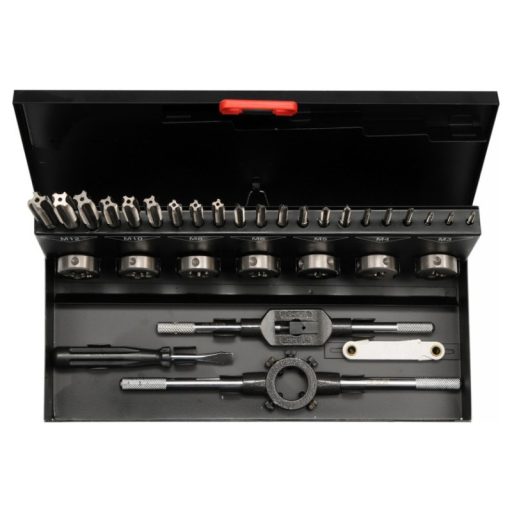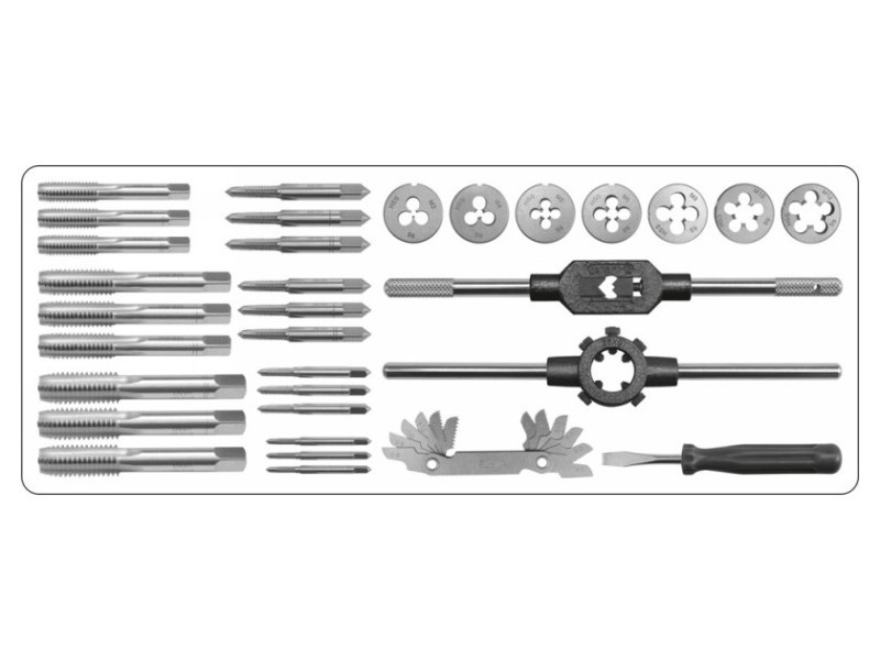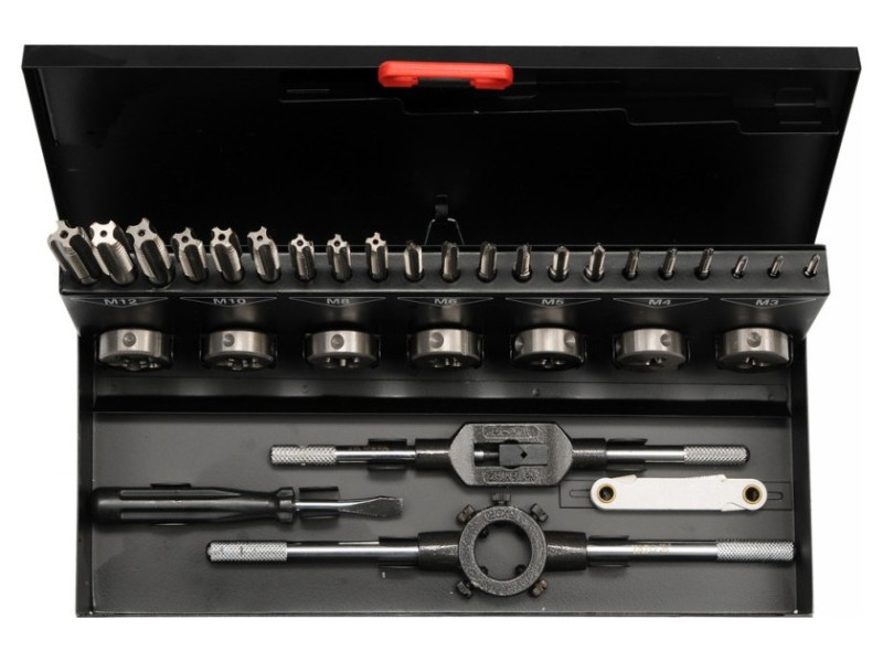 | Állítsa be a tartalmat | kézi menetfúró (előcsap, csupaszító, finiser) x21 (M3x0,5 mm, M4x0,7 mm, M5x0,8 mm, M8x1,25 mm, M10x1,5 mm, M12x1,75 mm), |
