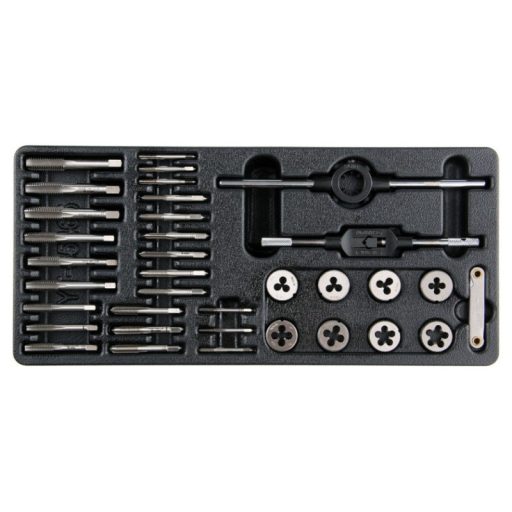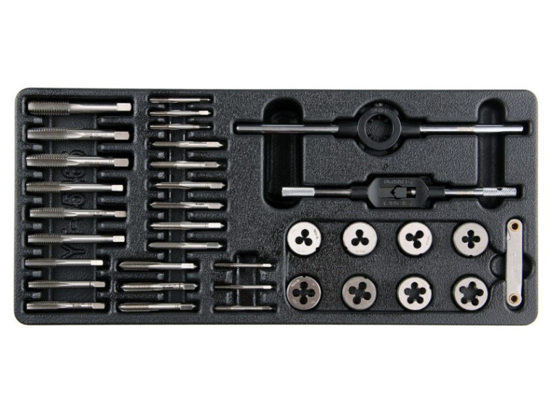 35 darabos szerszámkészletet és menetszerszámokat tartalmazó fiókbetét. - betét - menetszerszámok 3xM3x0.5, 3xM4x0.7, 3xM5x0.8, 3xM6x1.0, 3xM7x1.0, 3xM8x1.25, 3xM10x1.5, 3xM12x1.75 - gombszerszámok M3x0.5, M4x0.7, M5x0.8, M6x1.0, M7x1.0, M8x1.25, M10x1.5, M12x1.75 - gombgomb a gombszerszámokhoz - menettűrő 0.5-1.75 mm.