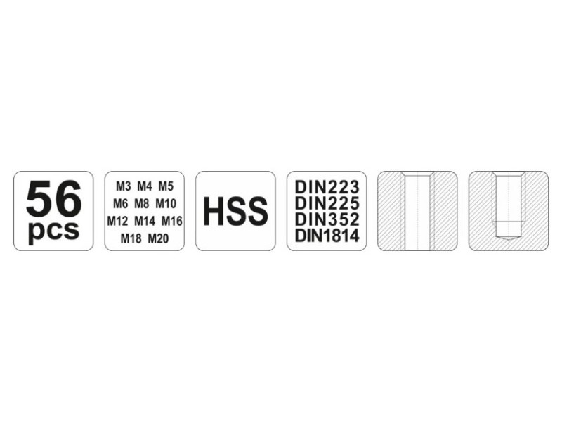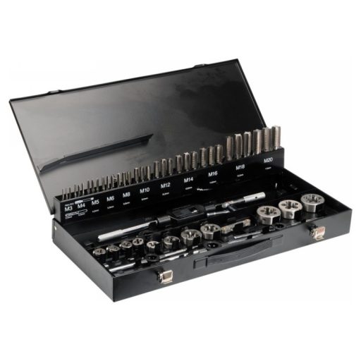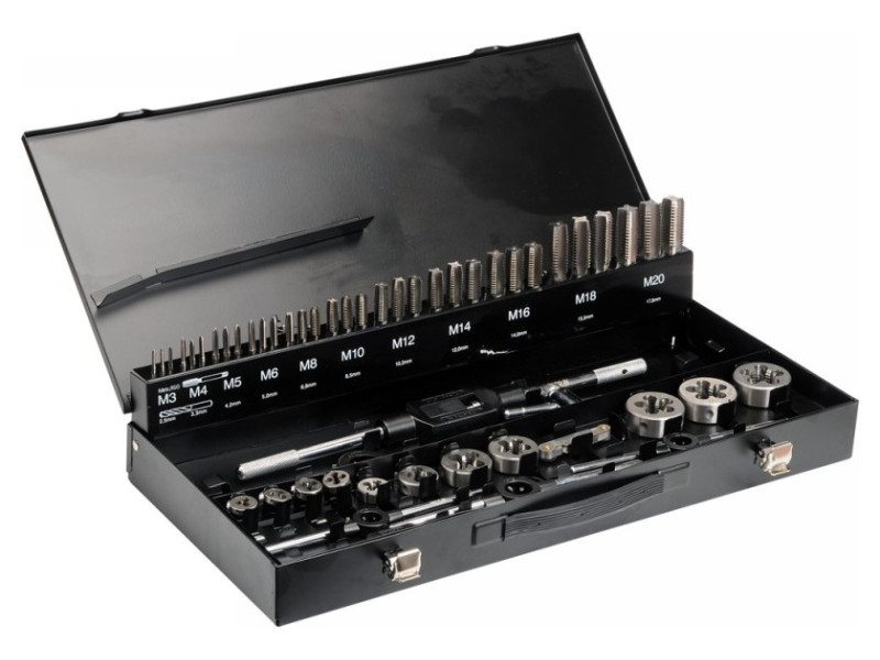 | Állítsa be a tartalmat | kézi menetfúró (előcsap, lehúzó, finiser) x33 (M3x0,5 mm, M4x0,7 mm, M5x0,8 mm, M6x1 mm, M8x1,25 mm, M10x1,5 mm, M12x1,75 mm, M14x2 mm, M16x2 mm , M18x2,5 mm, M20x2,5 mm), |