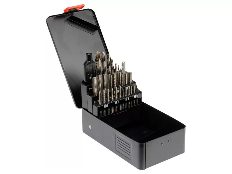 Állítsa be a tartalmatkézi menetfúró (előcsap, csupaszító, finiser) x21 (M3x0,5 mm, M4x0,7 mm, M5x0,8 mm, M8x1,25 mm, M10x1,5 mm, M12x1,75 mm), csap gomb (M1-M12),