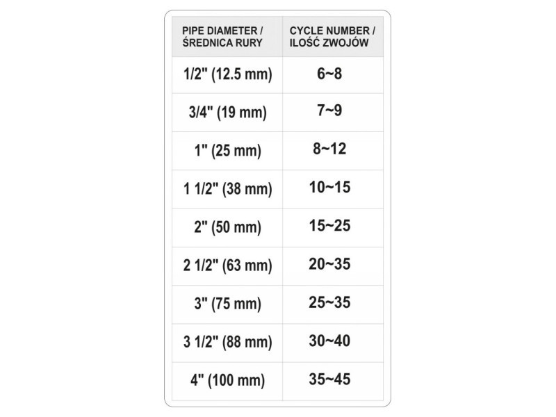 A mellékelt táblázat mutatja a javasolt tekercsek számát az egyes csőátmérőkhöz.
