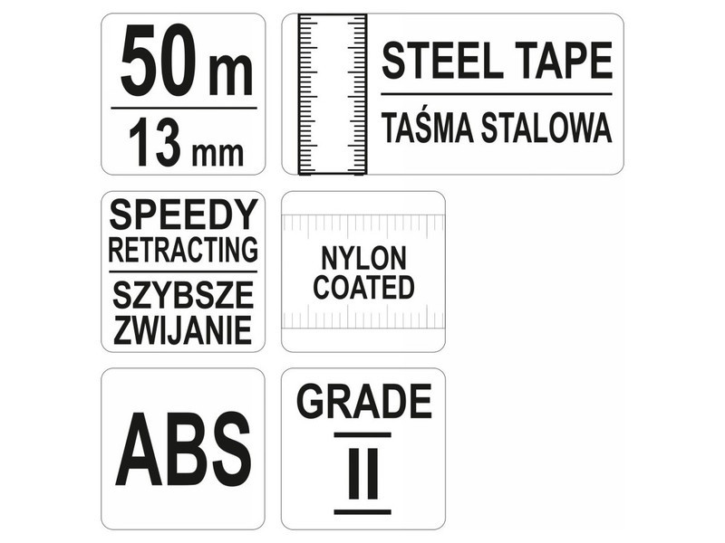 Második pontossági osztályban készült mérőszalag acéllemezből. Robusztus ABS műanyag tokban elhelyezve. Tekerőmechanizmus háromsebességes fogaskerékkel.