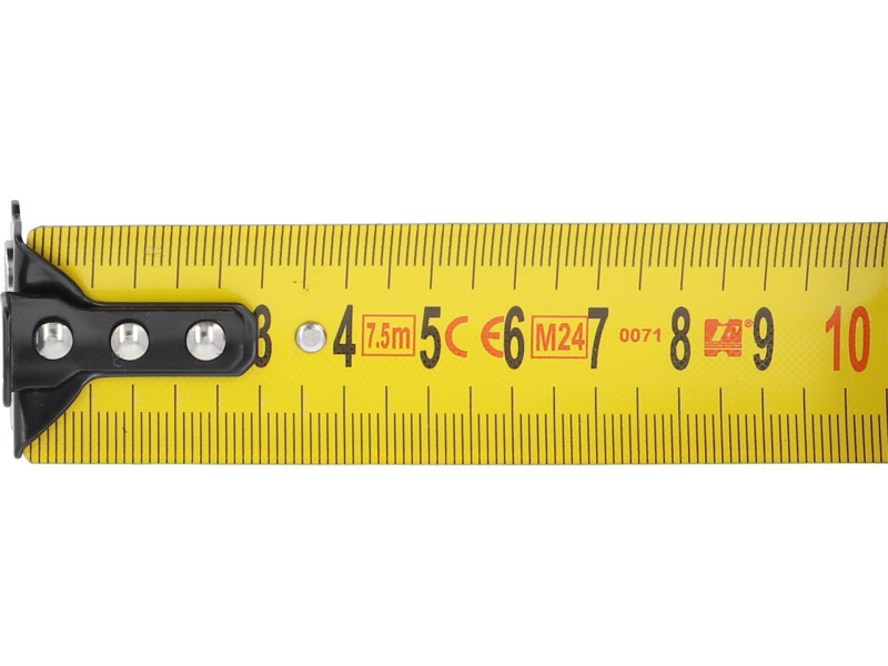 Visszahúzható mérőszalag extra széles, 32 mm-es acélszalaggal, 7,5 méter hosszúsággal. II. mérési pontossági osztályban készült. Rövid zsinórral ellátva, amely kényelmesen a csukló köré vezethető vagy a mérőszalagra akasztható.