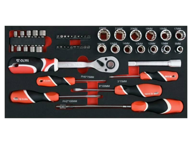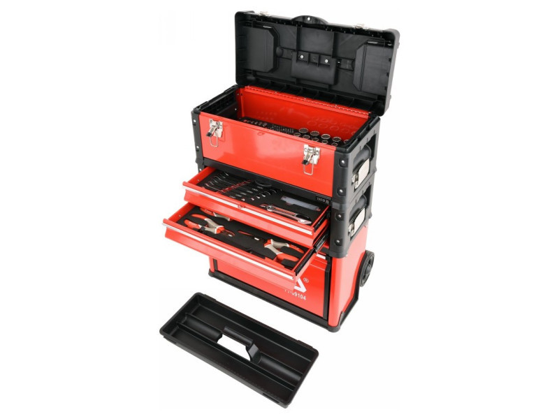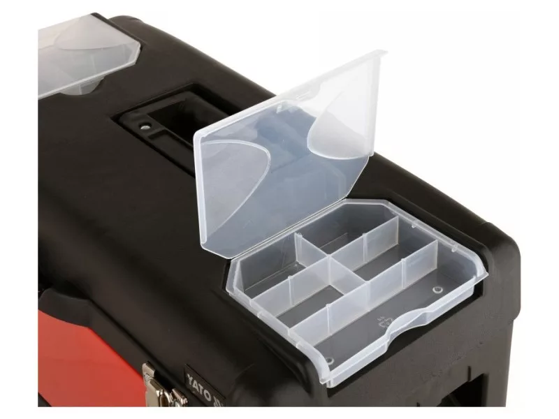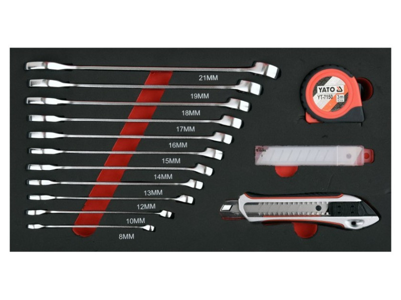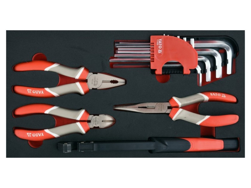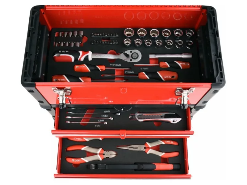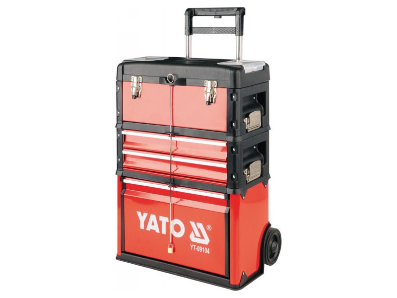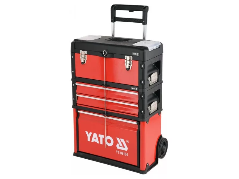 A felső és a középső modulok fém rögzítőelemekkel rendelkeznek a készletbe való kombináláshoz, az alumínium fogantyú pedig ezen felül zárral rendelkezik a modulok rögzítéséhez. A fiókokba kész szerszámkészletekkel ellátott YATO szerszámtálcák helyezhetők be.