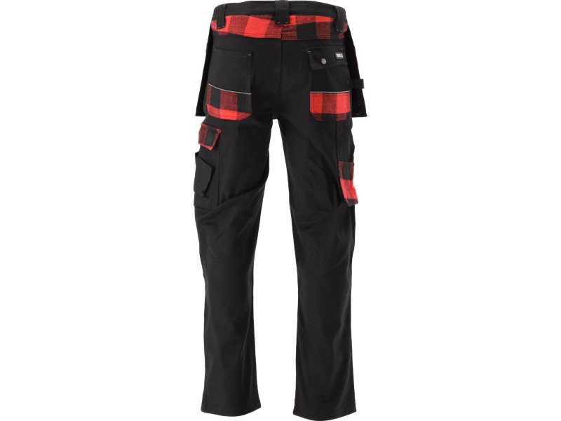 A zsebeken lévő piros és fekete flanel anyag dekoratív funkciót tölt be, míg hátul az öv alatt javítja a kényelmet, az illeszkedést és a hőhatást ezen a testrészen.
