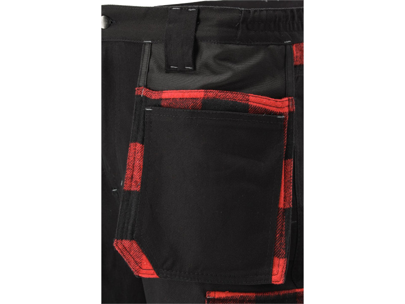 A zsebeken lévő piros és fekete flanel anyag dekoratív funkciót tölt be, míg hátul az öv alatt javítja a kényelmet, az illeszkedést és a hőhatást ezen a testrészen.