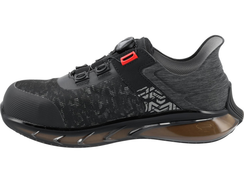Innovatív három anyagból készült talp. A külső, félig átlátszó TPU rész esztétikai előnyei mellett légpárna funkciót is ellát szinte az egész kerületén. Garantálja a munkavégzés fokozott kényelmét nem szokványos pozíciókban. A belső rész, amely érzékeny ETPU-ból készült, teljes mértékben alátámasztja a lábat, és kiválóan csillapítja a rezgéseket. Az olajálló, csúszásmentes futófelület javítja a stabilitást mind a tisztítószerrel borított, mind az olajos felületeken, amit a SR tanúsítvány is megerősít. A fokozott használati kényelemhez hozzájárul az innovatív popcorn design betét.
