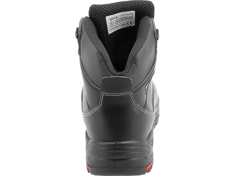 A TARAN S3 sorozat könnyű munkabakancs modellje ütésálló kompozit talpbetéttel, rugalmas, szúrásgátló talpbetéttel és két anyagból készült talppal, csúszásgátló gumitalppal, speciális bevágásokkal és tartós PU-ből készült betétekkel, piros színben. A cipő fokozott járási kényelmet nyújt, többek között a lábfejhez igazodó talpbetétnek köszönhetően.