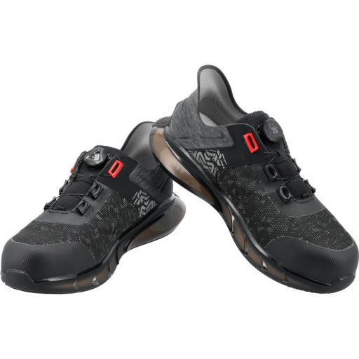 Innovatív három anyagból készült talp. A külső, félig átlátszó TPU rész esztétikai előnyei mellett légpárna funkciót is ellát szinte az egész kerületén. Garantálja a munkavégzés fokozott kényelmét nem szokványos pozíciókban. A belső rész, amely érzékeny ETPU-ból készült, teljes mértékben alátámasztja a lábat, és kiválóan csillapítja a rezgéseket. Az olajálló, csúszásmentes futófelület javítja a stabilitást mind a tisztítószerrel borított, mind az olajos felületeken, amit a SR tanúsítvány is megerősít. A fokozott használati kényelemhez hozzájárul az innovatív popcorn design betét.