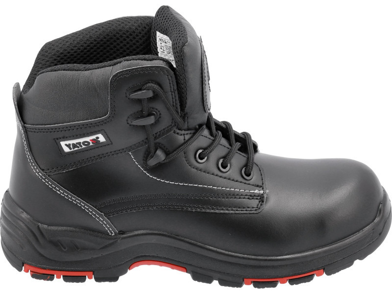 A TARAN S3 sorozat könnyű munkabakancs modellje ütésálló kompozit talpbetéttel, rugalmas, szúrásgátló talpbetéttel és két anyagból készült talppal, csúszásgátló gumitalppal, speciális bevágásokkal és tartós PU-ből készült betétekkel, piros színben. A cipő fokozott járási kényelmet nyújt, többek között a lábfejhez igazodó talpbetétnek köszönhetően.