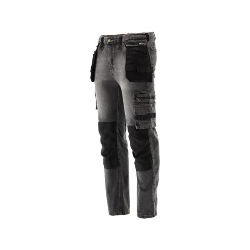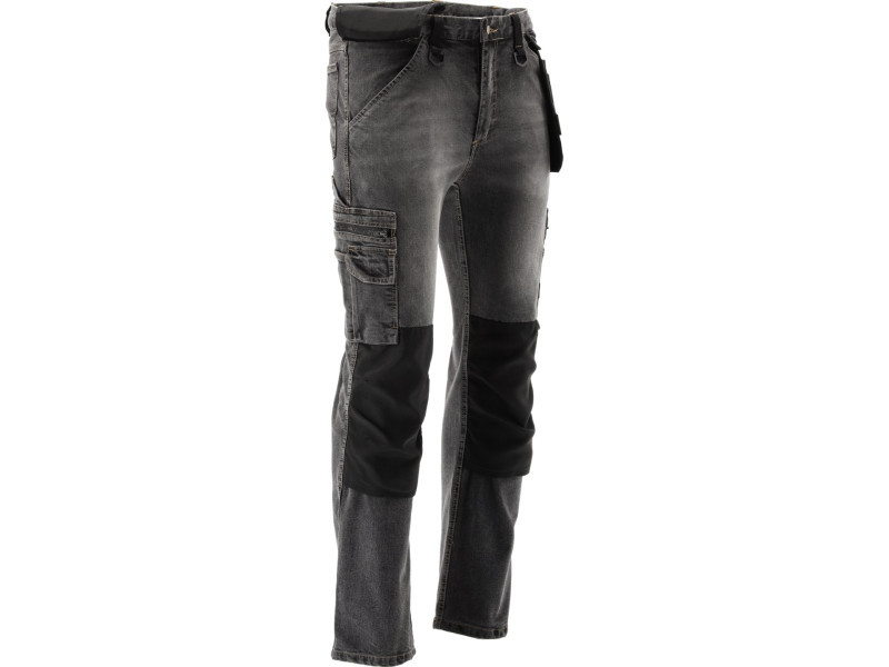 Összeszerelő nadrág elasztánnal dörzsölt és sztreccs farmerből. Nem kevesebb mint tizenhét zseb, köztük egy tépőzáras, két cipzáras és két levehető szerelőzseb. A robusztus anyagból készült számos alapzseb és szerelőzseb segít rendszerezni az ács, a tetőfedő vagy a vízvezeték-szerelő munkáját.