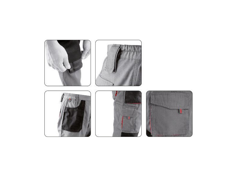 Munkanadrág öt zsebbel, amelyek közül három tépőzárral záródik, és speciális zsebekkel a térdvédők számára.
