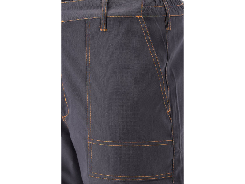 Munkanadrág öt zsebbel, amelyek közül kettő tépőzárral záródik, és speciális zsebekkel a térdvédők számára.