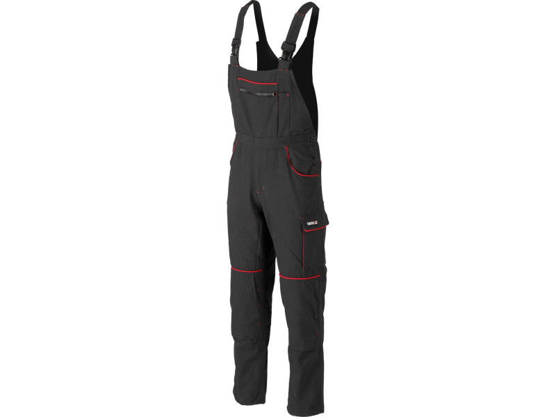 Kilenc zseb, köztük egy nagy zseb a mellkason cipzárral és egy kalapács hurokkal, segít a munka szervezésében. Anyagból készült pántok állíthatóval és rugalmas szalaggal a hátán. Az oldalakon gombokkal állítható szélességű derékpánt, valamint a hátsó részen behúzó gumiszalag. A térdeken tépőzáras térdzsebek. Sötét színű nadrág vörös vonalakkal, melyek nemcsak dekoratív funkciót látnak el, hanem megerősítik és védenek a nyitott zsebek szélén történő szakadástól.