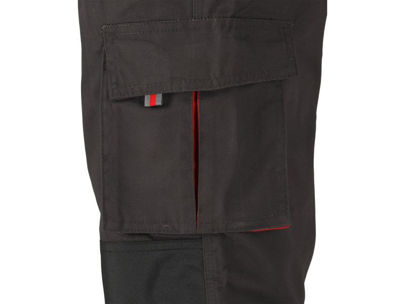 Hám típusú munkanadrág tizenegy zsebbel, amelyek közül hét tépőzárral záródik, és speciális zsebekkel a térdvédők számára.