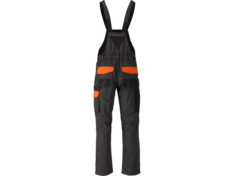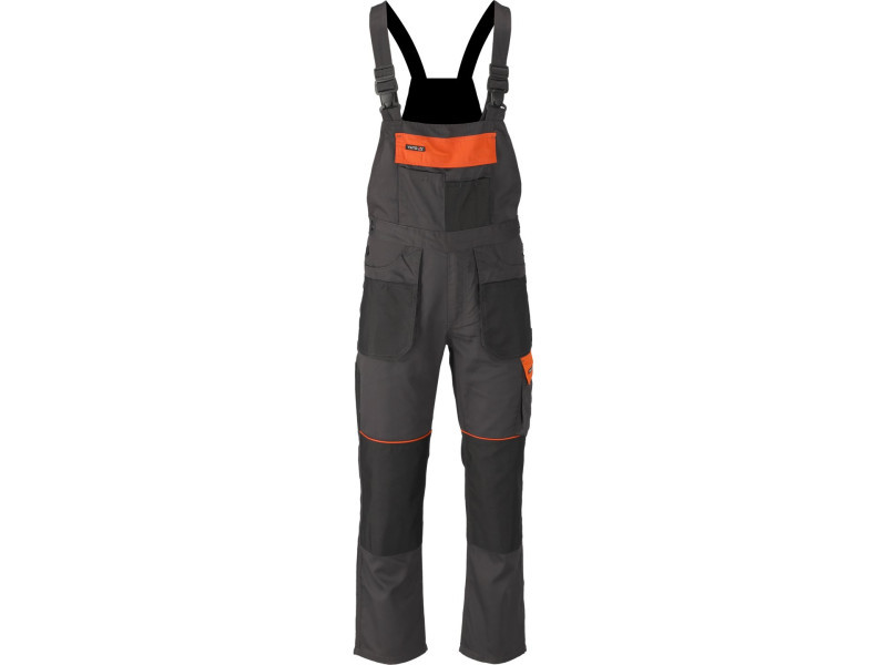 Hám típusú munkanadrág tizenhárom zsebbel, amelyek közül hét tépőzárral záródik, és speciális zsebekkel a térdvédők számára.