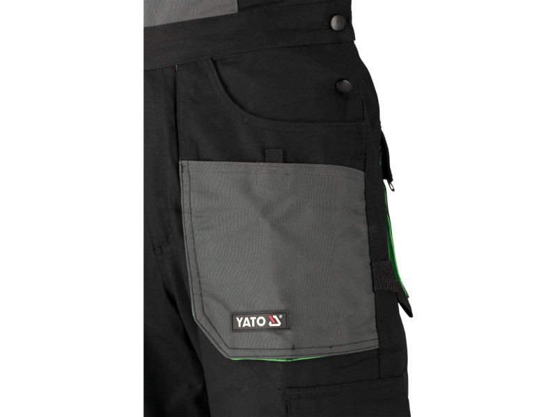 Hám típusú munkanadrág tíz zsebbel, amelyek közül hét tépőzárral záródik, és speciális zsebekkel a térdvédők számára.