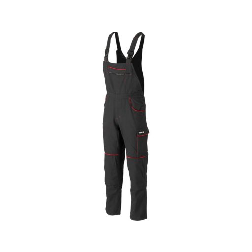 Kilenc zseb, köztük egy nagy zseb a mellkason cipzárral és egy kalapács hurokkal, segít a munka szervezésében. Anyagból készült pántok állíthatóval és rugalmas szalaggal a hátán. Az oldalakon gombokkal állítható szélességű derékpánt, valamint a hátsó részen behúzó gumiszalag. A térdeken tépőzáras térdzsebek. Sötét színű nadrág vörös vonalakkal, melyek nemcsak dekoratív funkciót látnak el, hanem megerősítik és védenek a nyitott zsebek szélén történő szakadástól.