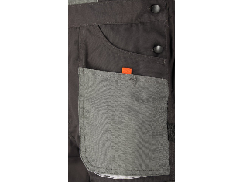 Hám típusú munkanadrág tizenegy zsebbel, amelyek közül hét tépőzárral záródik, és speciális zsebekkel a térdvédők számára.