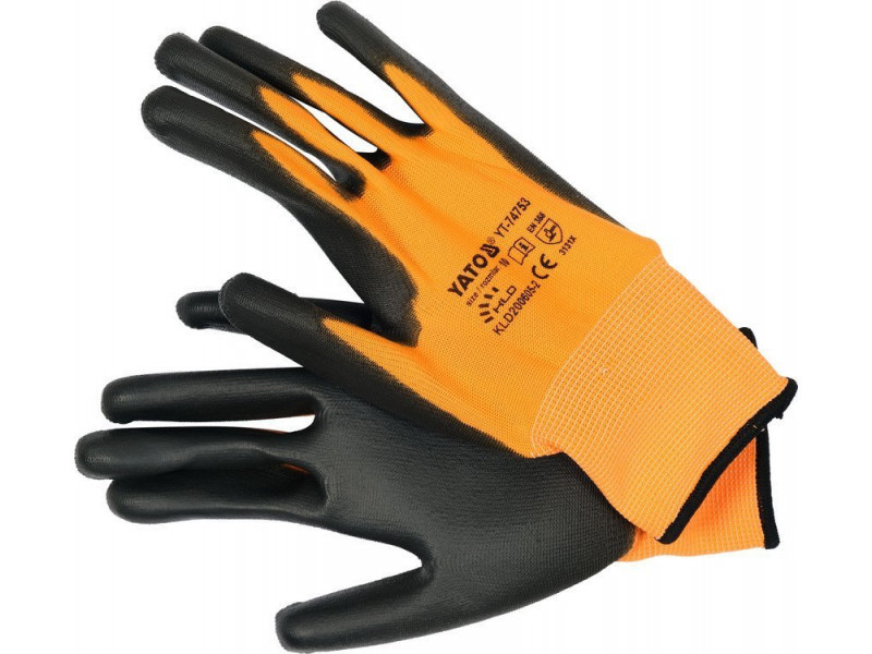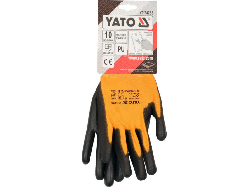 Védő munkakesztyűk, narancssárga poliészterből készültek, fekete poliuretánnal bevont fogó rész, speciális adalékkal, amely lehetővé teszi a érintőképernyős eszközök zökkenőmentes kezelését, például okostelefonok vagy tabletek esetén. A bevonat vastagsága szinte a legmagasabb kopásállóságot biztosítja az EN 388 szabvány szerint. A varratmentes kivitel magas minőségű poliészterből extra szakítószilárdságot garantál.