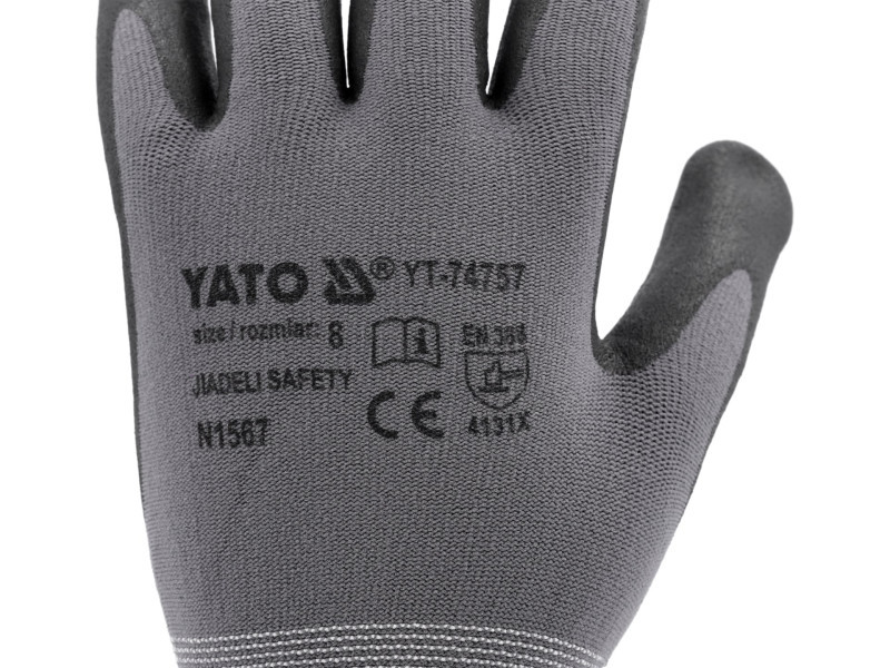 Sötétszürke, spandexszel kevert nejlonból készült munkavédelmi kesztyű, amely a markolat területénfekete habosított nitril bevonattal és nitril pöttyökkel van ellátva. A vastag bevonat és a pöttyök biztosítják a legmagasabb kopásállóságot az EN 388 szabvány szerint. A nitril további előnye a benzinnel, gázolajjal, paraffinnal, oldószerekkel, zsírral stb. szembeni ellenálló képesség. A kiváló minőségű nejlonból készült varratmentes szerkezet fokozott szakítószilárdságot és a rugalmasság hosszabb ideig történő megőrzését jelenti. A finom 15G öltés, azaz 15 öltés hüvelykenként, kisebb súlyt és még jobb tapadást jelent a kézhez. A nitril csúszásmentes felületek fokozzák a fogást és a száraz tárgyak biztos tartását.