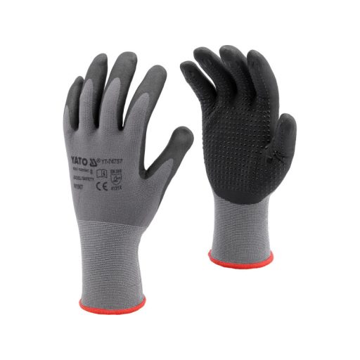 Sötétszürke, spandexszel kevert nejlonból készült munkavédelmi kesztyű, amely a markolat területénfekete habosított nitril bevonattal és nitril pöttyökkel van ellátva. A vastag bevonat és a pöttyök biztosítják a legmagasabb kopásállóságot az EN 388 szabvány szerint. A nitril további előnye a benzinnel, gázolajjal, paraffinnal, oldószerekkel, zsírral stb. szembeni ellenálló képesség. A kiváló minőségű nejlonból készült varratmentes szerkezet fokozott szakítószilárdságot és a rugalmasság hosszabb ideig történő megőrzését jelenti. A finom 15G öltés, azaz 15 öltés hüvelykenként, kisebb súlyt és még jobb tapadást jelent a kézhez. A nitril csúszásmentes felületek fokozzák a fogást és a száraz tárgyak biztos tartását.