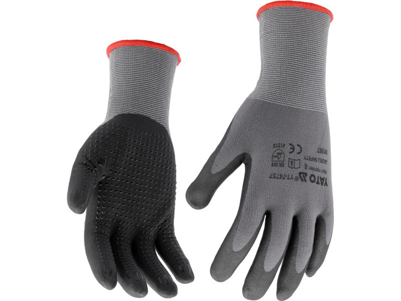 Sötétszürke, spandexszel kevert nejlonból készült munkavédelmi kesztyű, amely a markolat területénfekete habosított nitril bevonattal és nitril pöttyökkel van ellátva. A vastag bevonat és a pöttyök biztosítják a legmagasabb kopásállóságot az EN 388 szabvány szerint. A nitril további előnye a benzinnel, gázolajjal, paraffinnal, oldószerekkel, zsírral stb. szembeni ellenálló képesség. A kiváló minőségű nejlonból készült varratmentes szerkezet fokozott szakítószilárdságot és a rugalmasság hosszabb ideig történő megőrzését jelenti. A finom 15G öltés, azaz 15 öltés hüvelykenként, kisebb súlyt és még jobb tapadást jelent a kézhez. A nitril csúszásmentes felületek fokozzák a fogást és a száraz tárgyak biztos tartását.