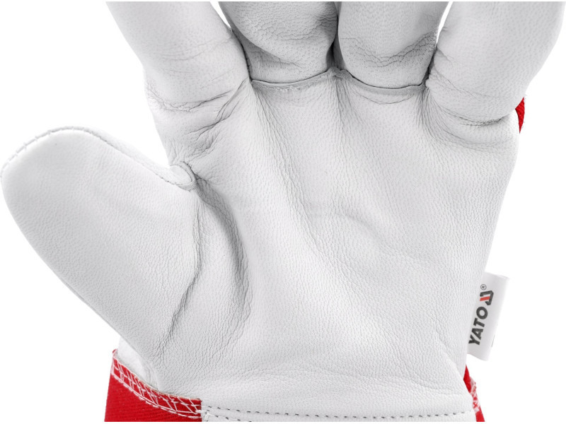Természetes bőrből és pamut kötött anyagból készült építőipari kesztyű piros színben. A kiváló minőségű kecskebőr nagyon kellemes tapintásúvá teszi a kesztyűt, és megakadályozza a túlzott izzadást. Különösen hasznosnak bizonyulnak nehéz építőipari munkáknál, a kertben és mindenütt, ahol nem szükséges a nagyfokú tapintási pontosság.