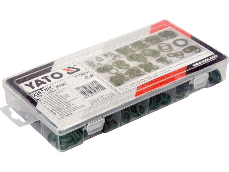 Ez a 225 O-gyűrűt tartalmazó praktikus készlet 18 különböző méret keverékét tartalmazza. Az O-gyűrűk HNBR gumiból készülnek. A praktikus csomagolás lehetővé teszi a kényelmes méret könnyű elérését.
