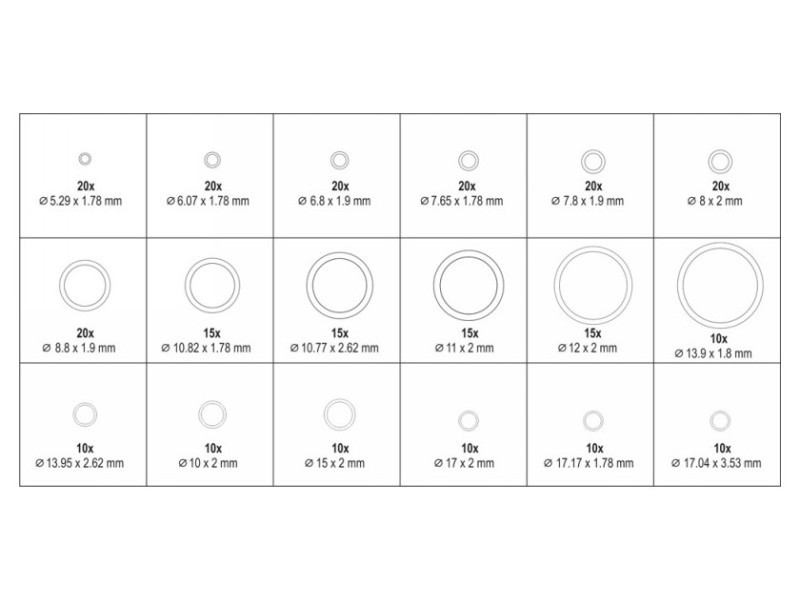 A készlet tartalma folyt.O11x2 mm, O12x2 mm; x10: O10x2 mm, O13.9x1.8 mm, O13.95x2.62 mm, O15x2 mm, O17x2 mm, O17.04x3.53 mm, O17.17x1.78 mm